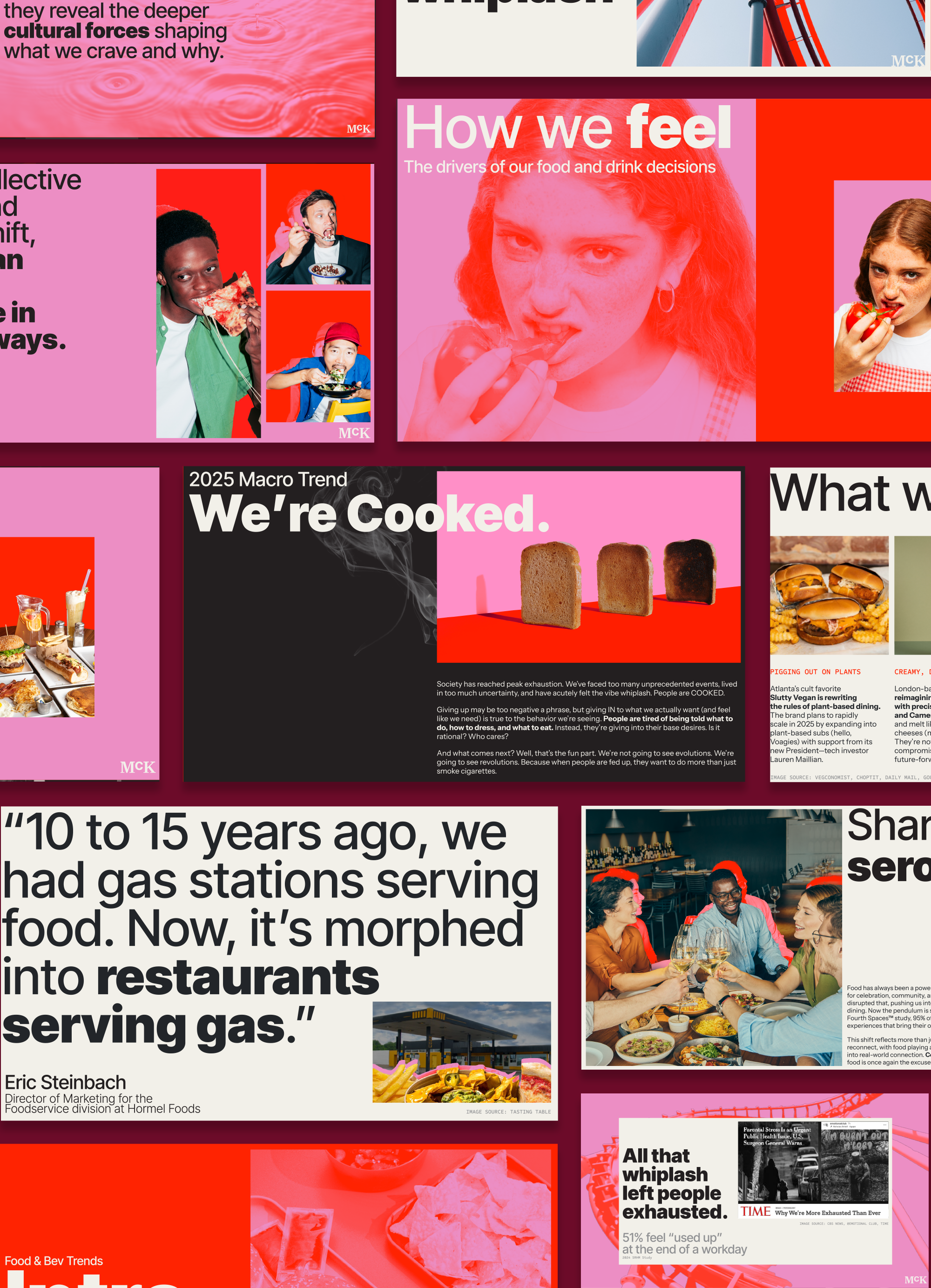 I adapted the core visual language into a series of modular, image-led social assets. Each post functioned as a concise ‘visual bite,’ using provocative photography and punchy headlines to stop the scroll while teasing key trends. This social extension of the Food Trends Report became a Playground for high-impact visual storytelling, all while maintaining the sophisticated aesthetic of the primary report