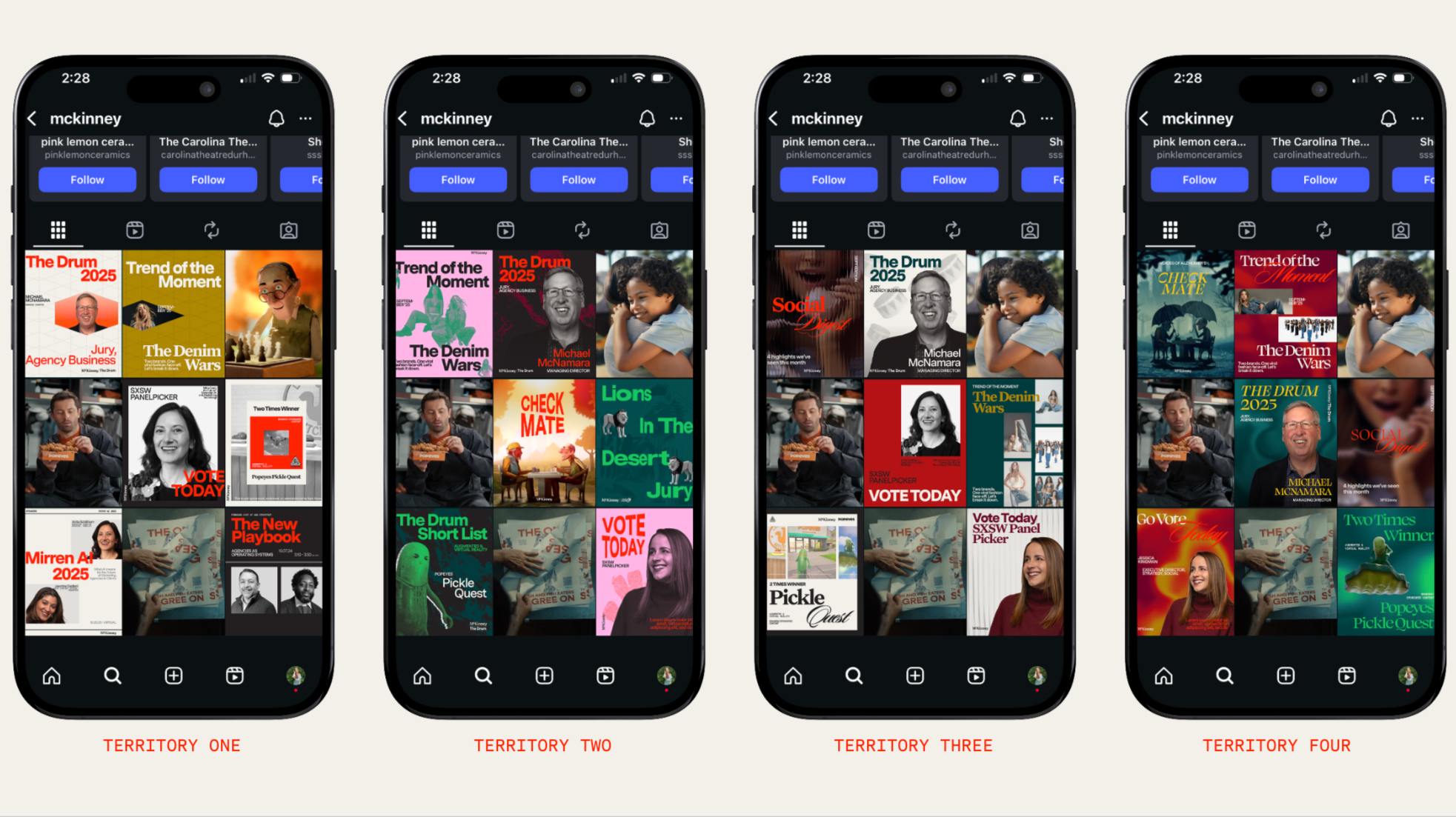 I began by pitching four distinct creative territories to the marketing team and Chief Creative Officers, each exploring a different way the rebrand could live in social. The territories ranged from a restrained, grid driven system with typographic precision, to bold color forward experimentation with expressive type and texture, to a minimal, craft led approach using jewel tones, refined typography, and subtle motion, allowing leadership to align on a direction that balanced clarity, flexibility, and brand elevation.