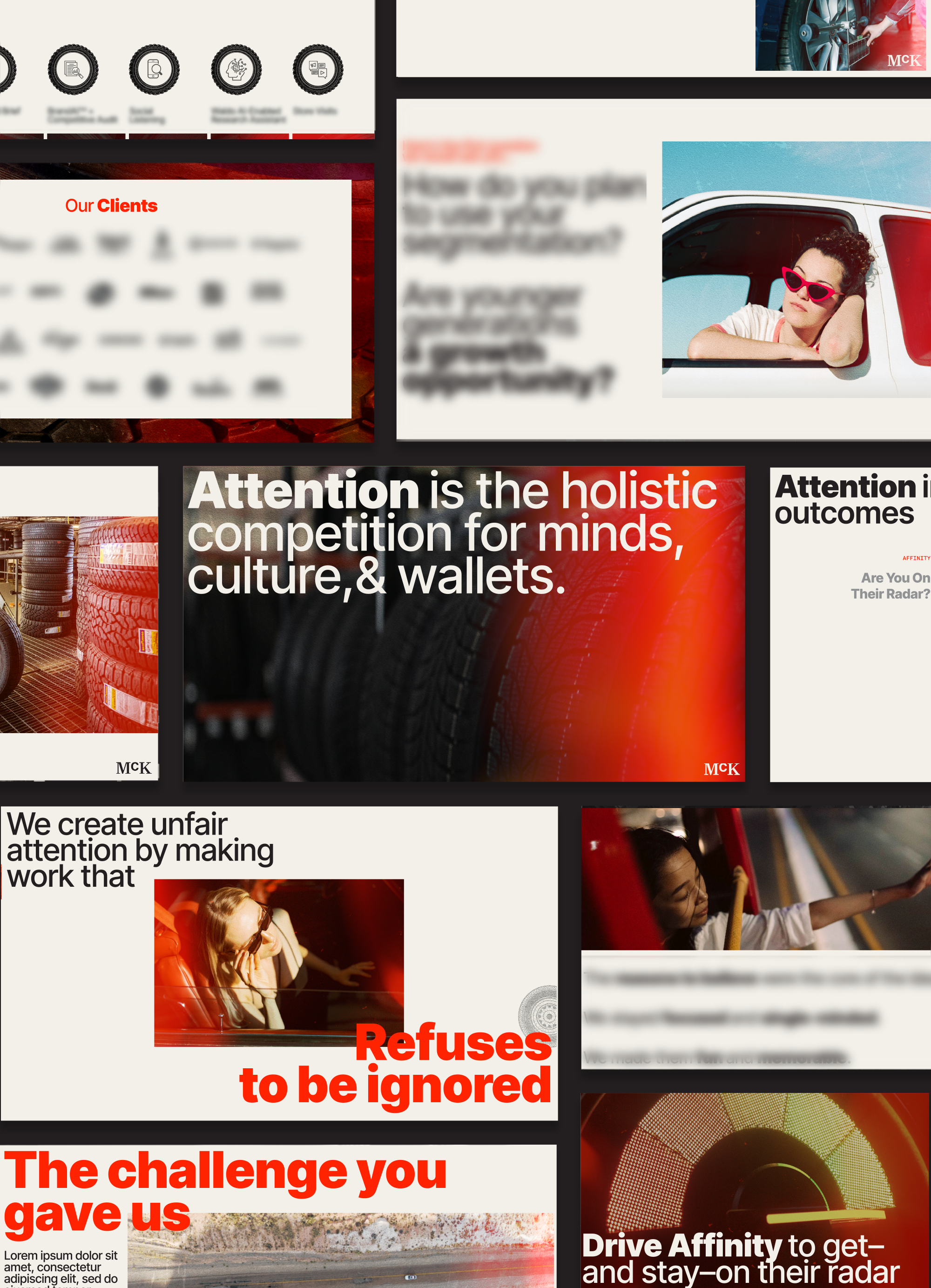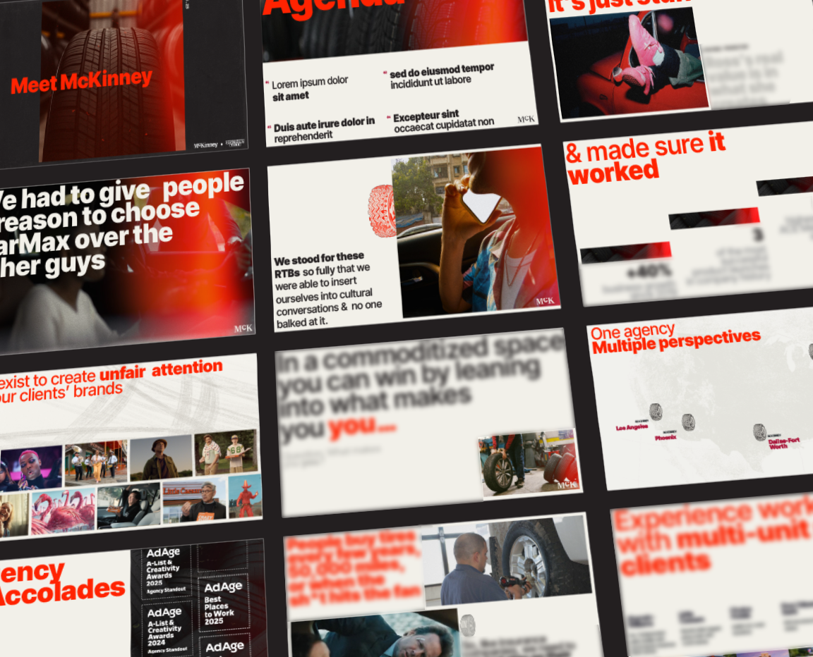 For this new business pitch, I designed within McKinney’s established new business approach, which fuses the core McKinney deck template with brand elements tailored to the client we were pitching. I stayed true to the McKinney brand through typography, layout, and structure, while elevating the system with high-design photography and a stylized retro flare and grain treatment to add depth and character. Custom-designed tire icons were introduced as supplemental elements to anchor key moments and guide attention, allowing powerful imagery to lead the narrative and carry the story throughout the deck.