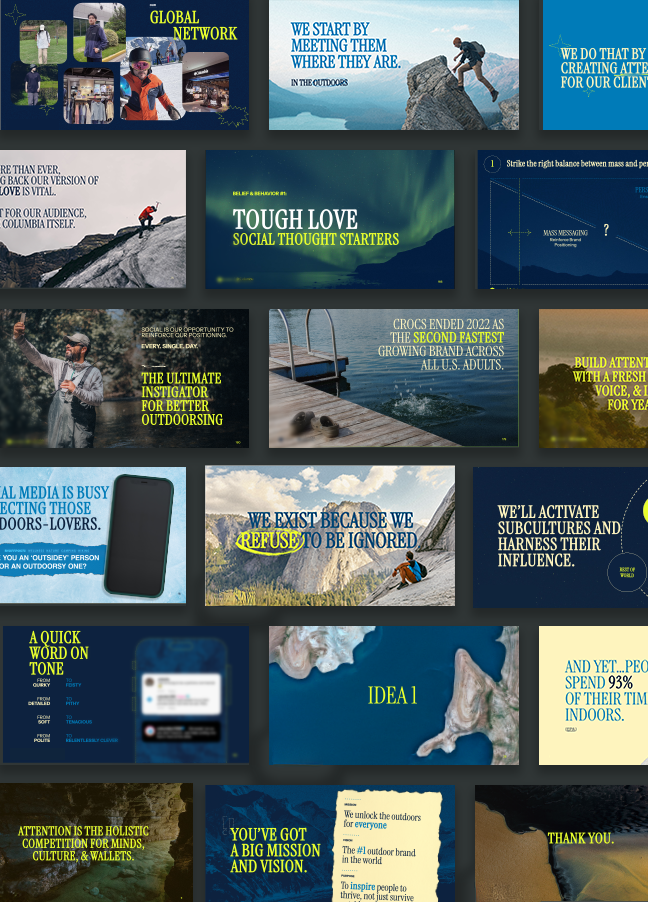 For this B2C business deck, I developed a bespoke visual system that leans heavily on outdoors-focused imagery to capture the brand’s spirit of adventure and connection to nature. Rather than relying on existing McKinney branding, I built an entirely new design language tailored to the client. I wanted it to feel energetic & provocative.