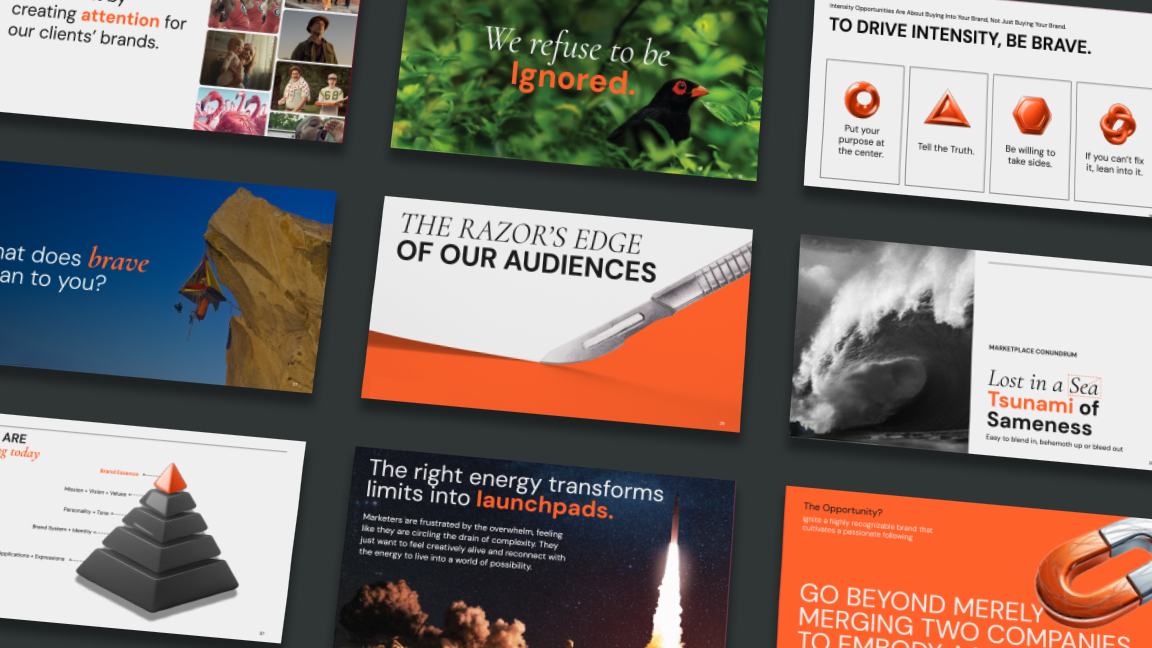 To inject energy into the deck, I paired these restrained layouts with full-bleed, nature-inspired imagery that feels bold and slightly provocative. These visuals created moments of impact without overwhelming the content. I also incorporated bright orange abstract, rendered shapes to help visualize and elevate key infographic moments.